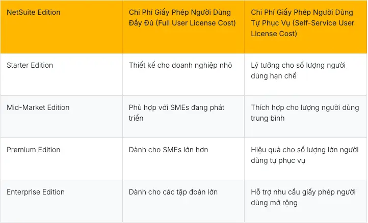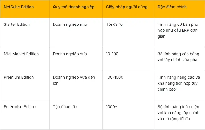 - Phân khúc Dịch vụ Cao cấp NetSuite: Thiết kế cho doanh nghiệp lớn cần mở rộng truy cập và dung lượng dữ liệu