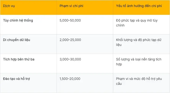 Đặc thù kinh doanh của bạn có thể yêu cầu những tính năng tùy chỉnh riêng biệt, các chuyên gia Oracle NetSuite có thể phát triển theo yêu cầu cụ thể của bạn. Chi phí cho những tùy chỉnh này thường được tính theo giờ làm việc, đòi hỏi kế hoạch cẩn trọng để đảm bảo bạn đầu tư thông minh vào các chức năng thực sự phục vụ mục tiêu kinh doanh. Việc lồng ghép hợp lý các yếu tố chi phí này vào kế hoạch tài chính sẽ giúp bạn tránh được những khoản phát sinh ngoài dự kiến sau này.