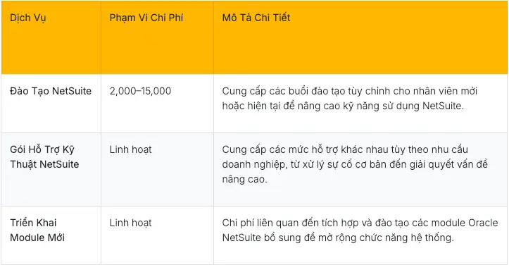 Khi đề cập đến chi phí triển khai NetSuite, cần nhấn mạnh rằng hành trình không kết thúc sau giai đoạn thiết lập ban đầu. Doanh nghiệp phải lên kế hoạch cho các khoản đầu tư duy trì như chi phí đào tạo Oracle NetSuite liên tục - yếu tố sống còn để khai thác tối đa tiềm năng phần mềm. Bên cạnh đó, dịch vụ hỗ trợ Oracle NetSuite đóng vai trò thiết yếu trong việc duy trì hiệu suất hệ thống và xử lý các sự cố phát sinh.