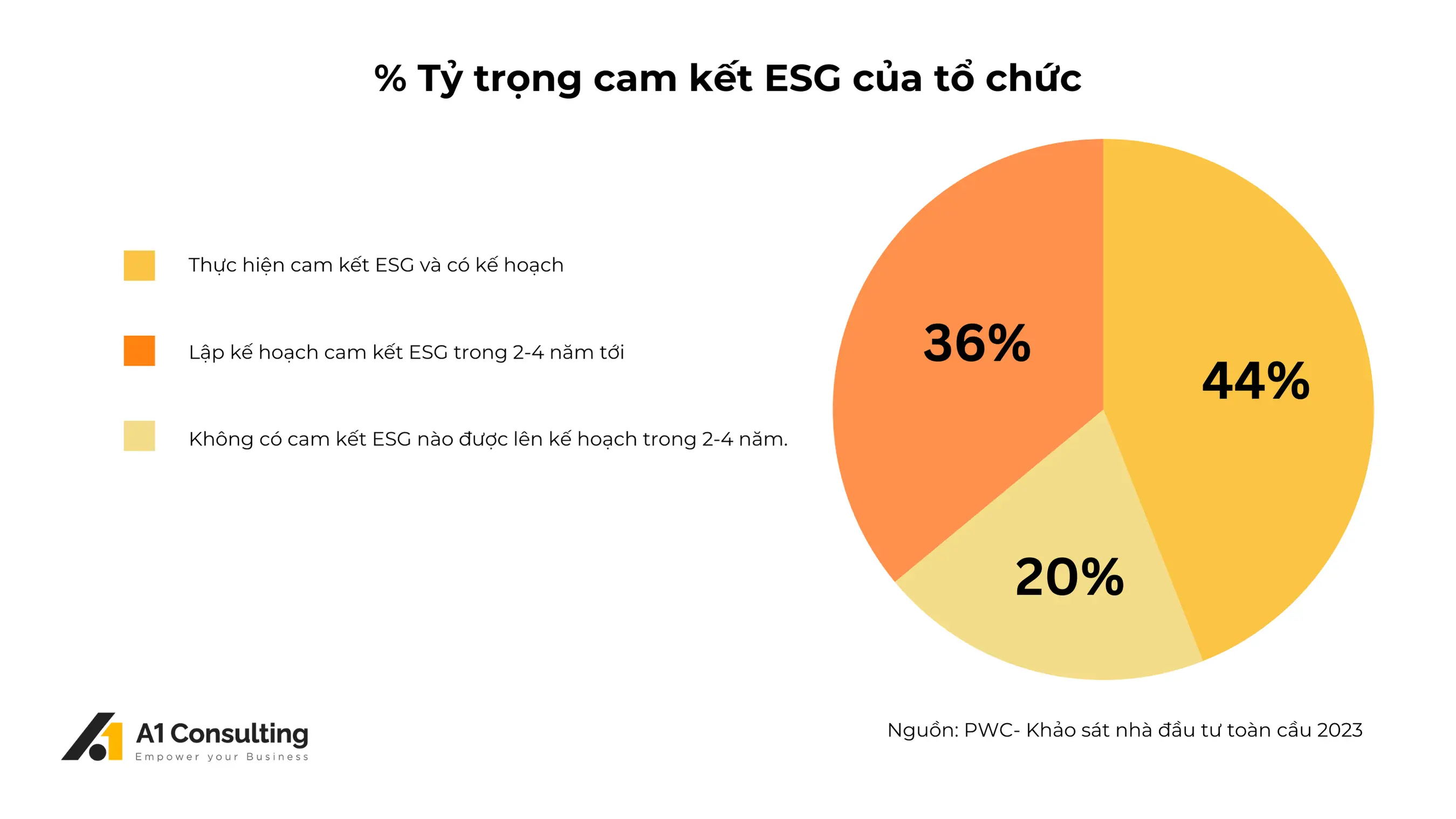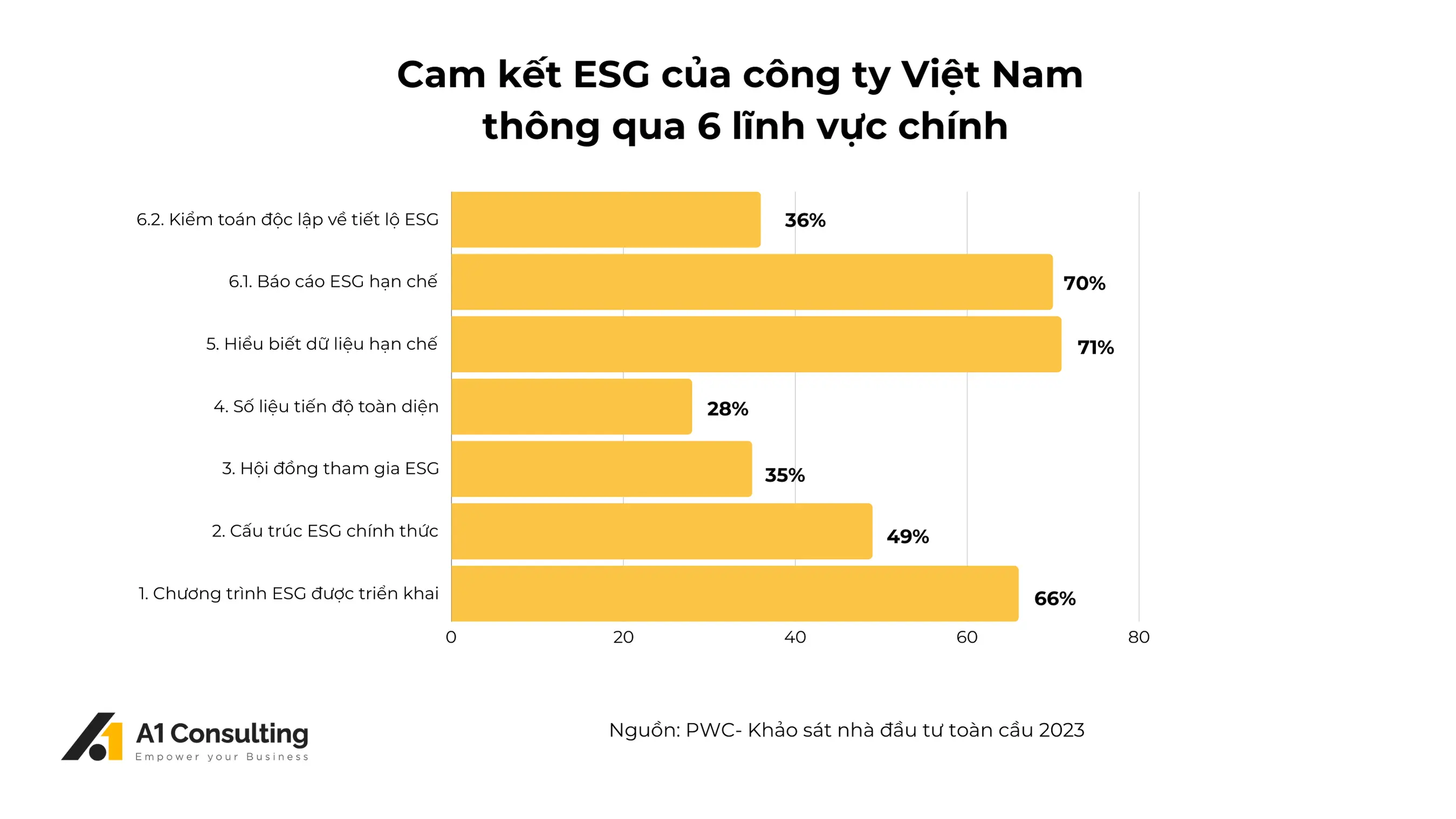 Trong một khảo sát do PwC và Viện Thành viên Hội đồng Quản trị Việt Nam (VIOD) thực hiện với 234 người tham gia (bao gồm 55 người từ các công ty niêm yết), kết quả cho thấy 80% doanh nghiệp Việt Nam đã cam kết hoặc dự định thực hiện các cam kết về ESG trong 2-4 năm tới.