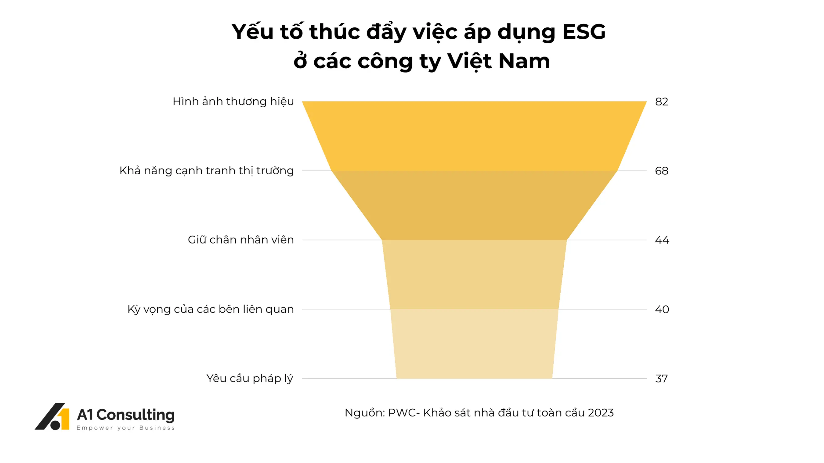 Các công ty đang ngày càng có động lực để giải quyết các vấn đề ESG do áp lực từ người tiêu dùng, nhân viên và nhà đầu tư. Tại Việt Nam, 82% người tham gia khảo sát cho rằng hình ảnh và danh tiếng thương hiệu là động lực chính thúc đẩy họ theo đuổi các sáng kiến ESG, tiếp theo là mong muốn duy trì tính cạnh tranh (68%). Các yếu tố khác bao gồm việc giữ chân nhân viên và đáp ứng áp lực từ nhà đầu tư và cơ quan chính phủ.