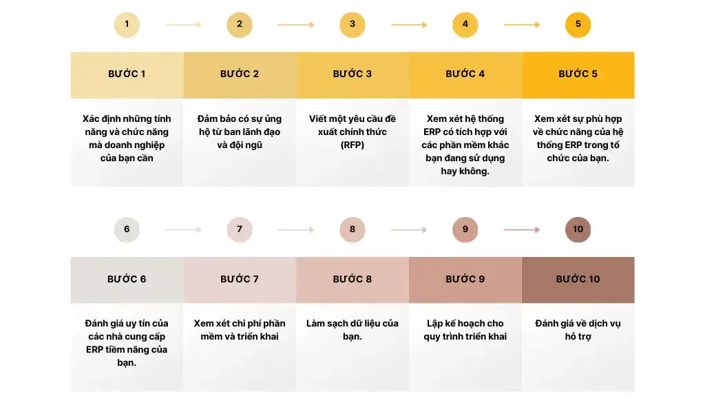 Chọn một hệ thống ERP phù hợp có thể là một quá trình tốn thời gian, vì vậy việc có một kế hoạch sẽ rất có lợi. Mặc dù không phải là hướng dẫn đầy đủ để chọn đúng hệ thống ERP cho doanh nghiệp của bạn, danh sách 10 Bước dưới đây sẽ giúp bạn khởi đầu đúng đắn. Bằng cách làm theo những Bước này và bỏ ra thời gian và due diligence cần thiết, hầu hết các tổ chức sẽ có thể chọn được hệ thống ERP phục vụ tốt nhất cho nhu cầu của họ.