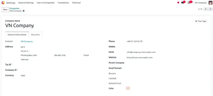 Xác minh thiết lập công ty hiện tại rất quan trọng để đảm bảo dữ liệu và chức năng chính xác trong Odoo. Nếu cần, chúng ta có thể tạo một công ty mới với các thông tin cần thiết. Thiết lập này xác định các chi tiết quan trọng về công ty. Hãy vào Cài đặt > Người dùng và Công ty > Công ty (Settings > Users and Companies > Companies). Chọn công ty mà bạn muốn kiểm tra cấu hình từ danh sách.