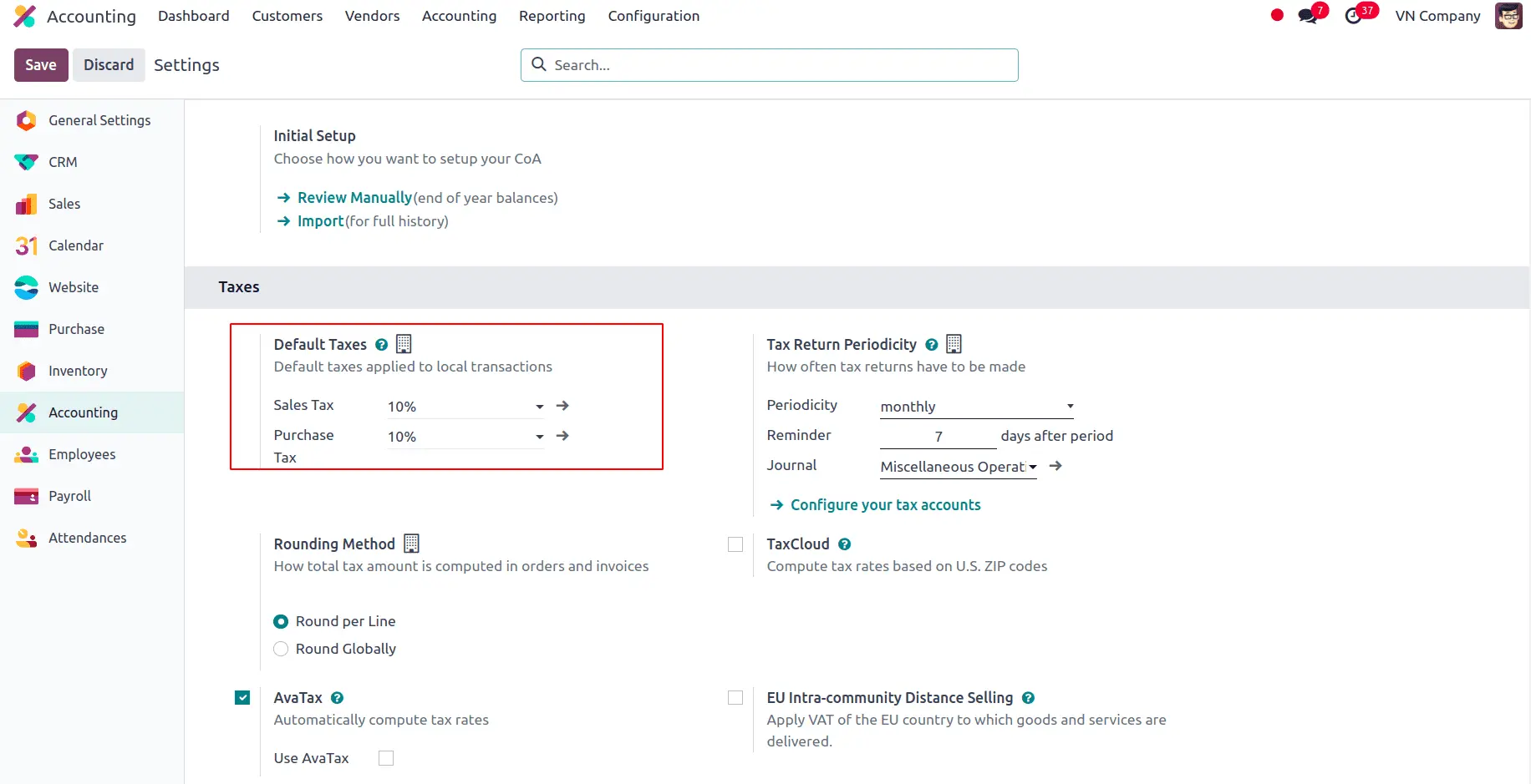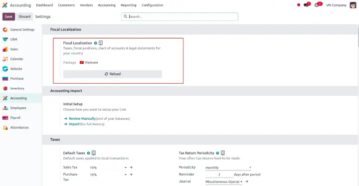 Sau khi cài đặt kế toán cho Việt Nam và đảm bảo thông tin công ty chính xác, bạn có thể vào mục Kế toán > Cấu hình > Cài đặt (Accounting > Configuration > Setting) để kiểm tra các thay đổi. Tại đây, bạn sẽ thấy Việt Nam được chọn làm tài chính mặc định.
