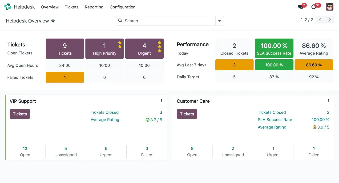 Trong Odoo Helpdesk, bạn cóp thể tạo các phiếu hỗ trợ, theo dõi thời gian phản hồi, đánh giá mức độ hài lòng của khách hàng.
