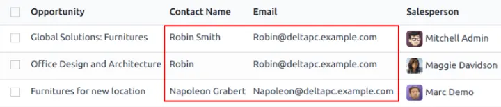 Các lead/opportunity đến từ cùng một công ty, nhưng có người liên hệ khác nhau, có thể có nhu cầu khác nhau. Trong trường hợp này, tốt hơn là không nên gộp các bản ghi này. Tuy nhiên, việc chỉ định cùng một nhân viên kinh doanh hoặc nhóm bán hàng có thể giúp tránh trùng lặp công việc và giảm thiểu hiểu lầm.