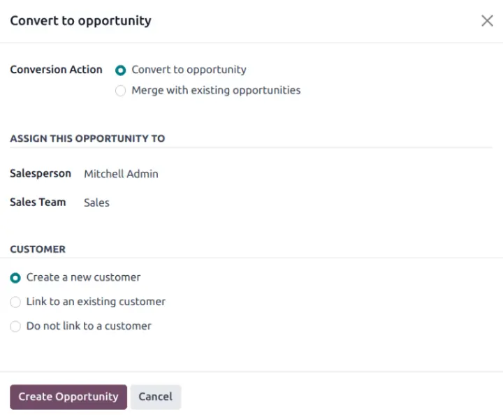 - Create a new customer: Tạo một khách hàng mới từ thông tin trong lead.