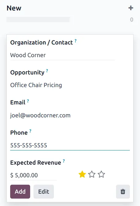 Để đánh dấu một opportunity là đã mất, trước tiên hãy mở ứng dụng CRM, sau đó chọn một opportunity từ pipeline bằng cách nhấp vào thẻ Kanban tương ứng. Thao tác này sẽ hiển thị biểu mẫu chi tiết của opportunity đó.