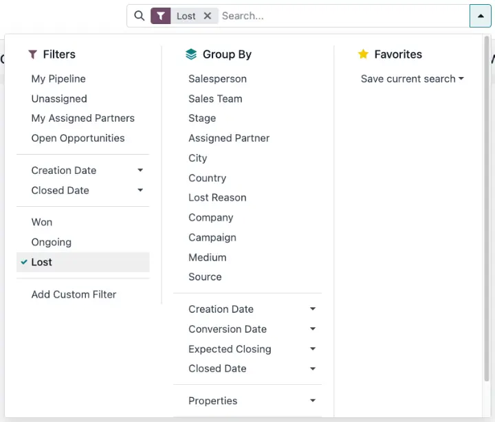 Để khôi phục một lead đã mất, vào CRM app ‣ Leads, sau đó nhấp vào biểu tượng ![dropdown icon] (mũi tên thả xuống) bên phải thanh tìm kiếm để mở menu chứa các cột Filters, Group By và Favorites. Tại cột Filters, chọn Lost. Tất cả các lead đã mất sẽ hiển thị trong trang Leads. Nhấp vào lead bạn muốn khôi phục để mở form chi tiết của lead đó.