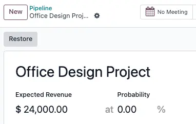 Từ biểu mẫu chi tiết của opportunity đã mất, nhấp vào Khôi phục (Restore) ở góc trên bên trái. Thao tác này sẽ xóa banner đỏ "Lost" khỏi biểu mẫu, đánh dấu rằng opportunity đã được khôi phục.
