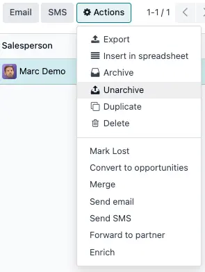 Để khôi phục nhiều lead cùng lúc, vào CRM app ‣ Leads, mở menu Filters, chọn Lost. Sau đó, tích vào checkbox bên trái của mỗi lead bạn muốn khôi phục. Khi đã chọn xong, nhấp vào menu Actions ở đầu trang Leads. Từ menu này, chọn Unarchive. Việc này sẽ loại bỏ các lead đã chọn khỏi bộ lọc Lost, vì chúng không còn thỏa điều kiện "đã mất".