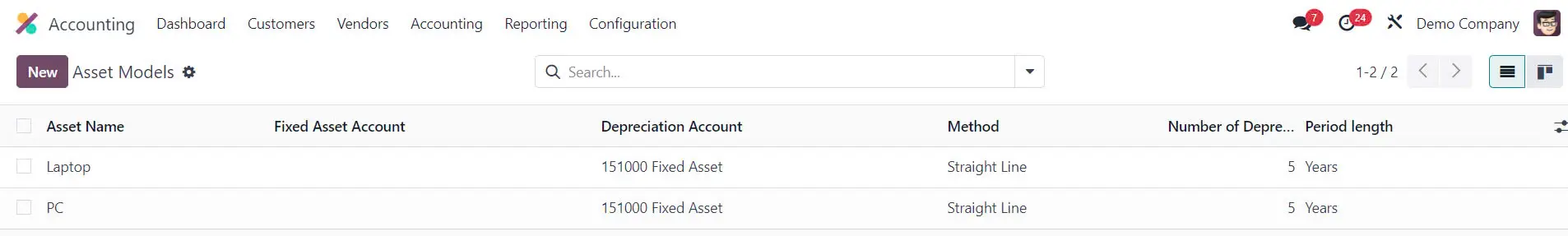Khi tạo một mô hình tài sản, người dùng cần chỉ định tên, thời gian khấu hao, phương pháp khấu hao (tức là khấu hao giảm dần, đường thẳng hoặc kết hợp) và thông tin kế toán. Điều này bao gồm việc cấu hình các tài khoản chi phí, tài khoản khấu hao và tài khoản mua tài sản. Ngoài ra cũng cũng cần quyết định cách tính khấu hao theo thời gian (tức là phân bổ đều hoặc dựa trên các giai đoạn cụ thể).