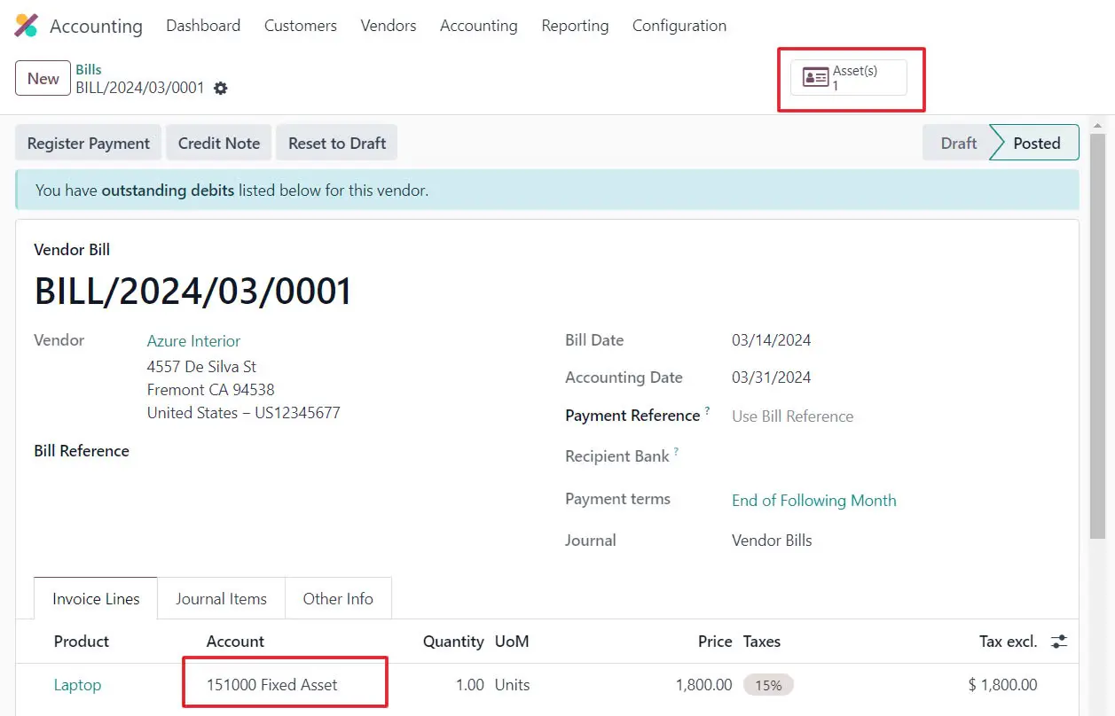Bạn sẽ thấy tài sản tương ứng đã được ghi nhận trước đó trong Odoo.
