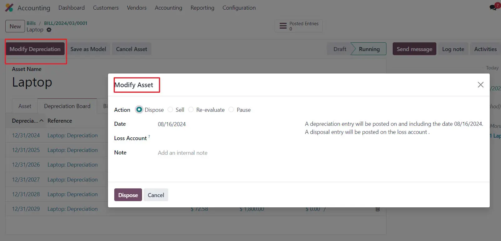 Từ đây, người dùng có thể chọn một trong các hành động sau: loại bỏ, bán hoặc đánh giá lại, người dùng có thể thay đổi chúng. Mỗi hành động yêu cầu thông tin cụ thể, chẳng hạn như ngày loại bỏ, hóa đơn bán hàng, hoặc các giá trị khấu hao mới.