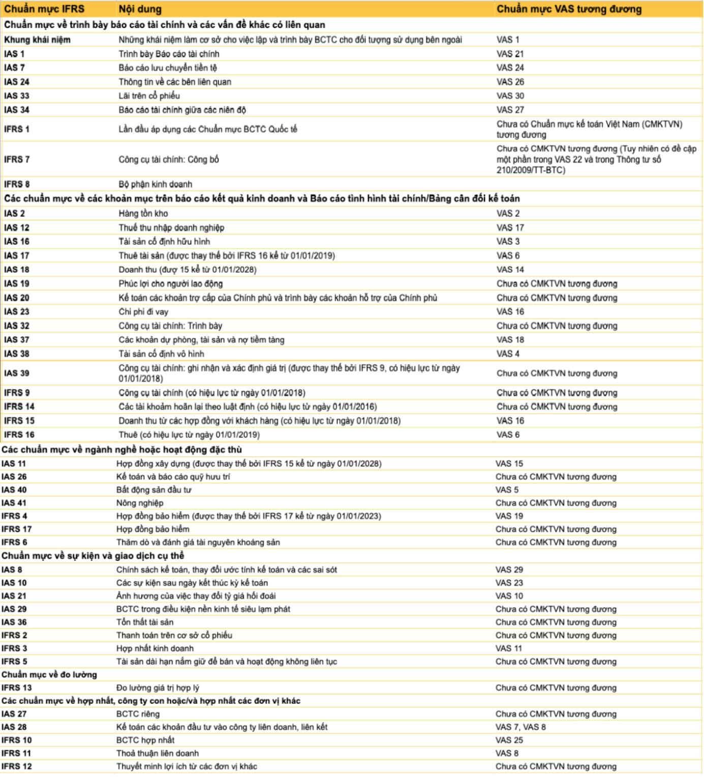 So sánh IFRS và VAS cho thấy nhiều chuẩn mực báo cáo quốc tế không có chuẩn mực VAS tương đương. Như sau: