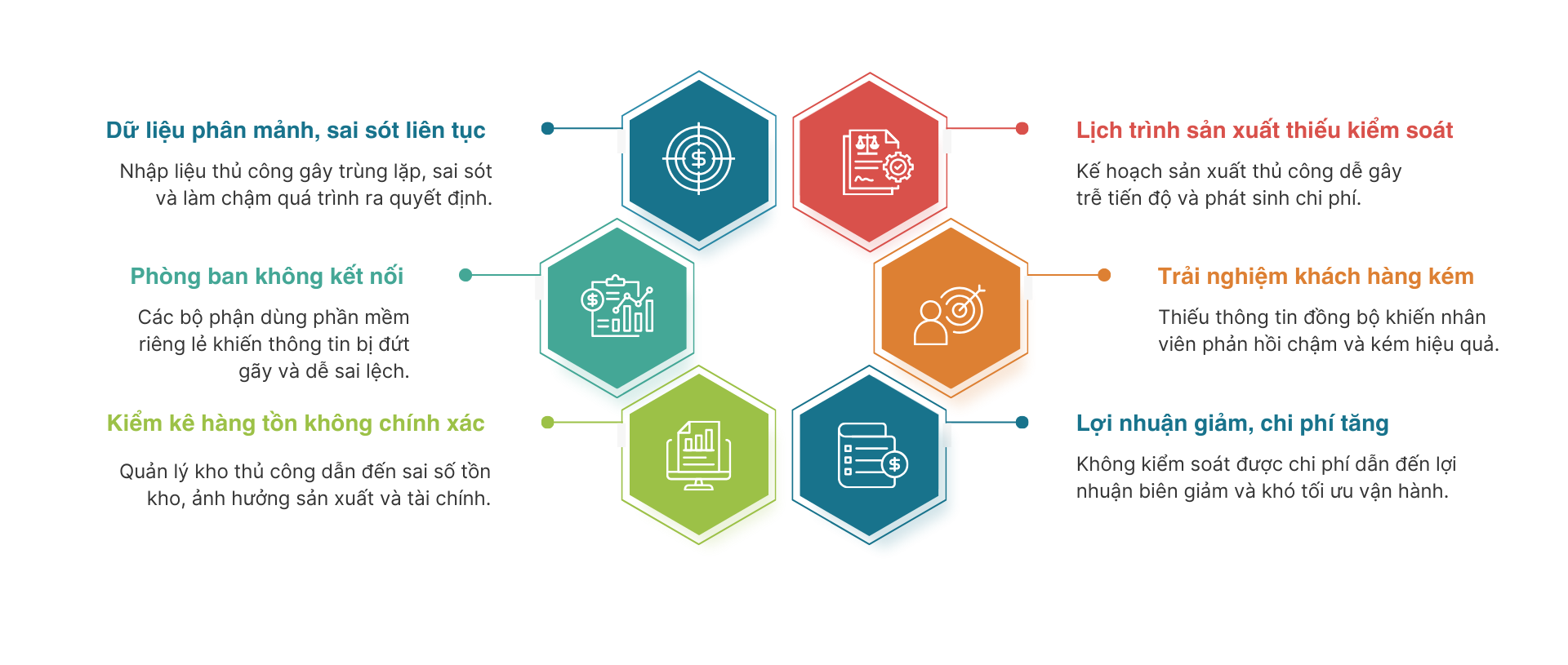 ERP giúp giải quyết vấn đề này bằng cách tự động hóa và chuẩn hóa các quy trình vận hành. Khi dữ liệu được cập nhật theo thời gian thực và chia sẻ giữa các phòng ban, doanh nghiệp có thể kiểm soát hoạt động một cách hiệu quả hơn và giảm thiểu những rủi ro do sai sót thủ công.