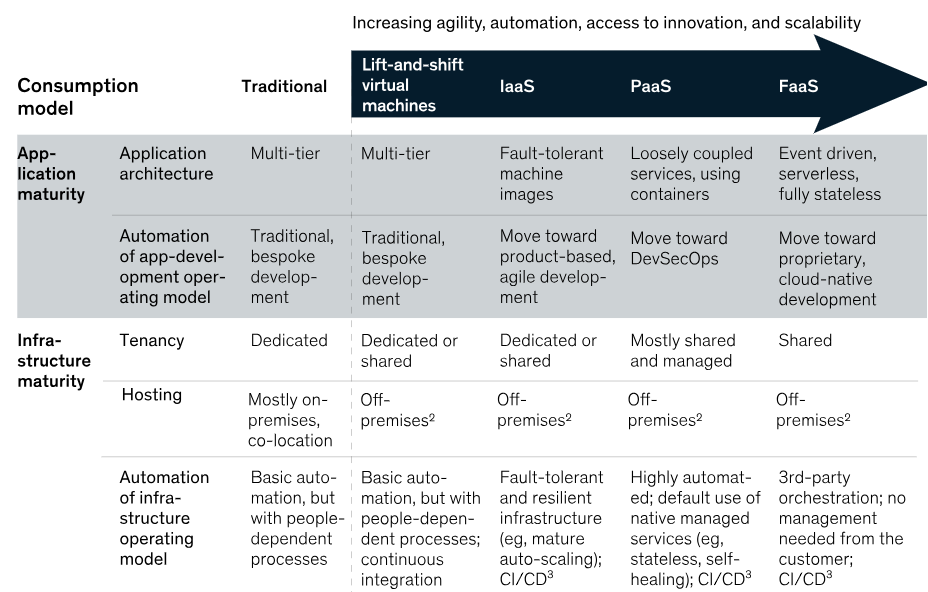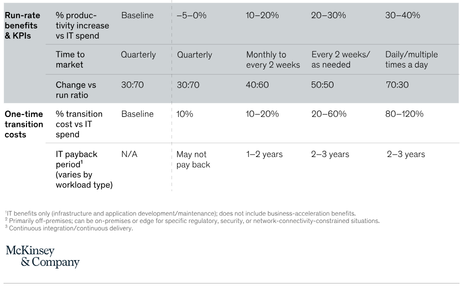 Đầu tư vào nền tảng đám mây để tăng khả năng thích ứng, đổi mới và phục hồi của doanh nghiệp, từ đó tăng lợi nhuận. Tuy nhiên, việc này đòi hỏi doanh nghiệp cần kết hợp tập trung hiện đại hóa để có thể mở rộng nhanh chóng trên toàn bộ tổ chức. Cách tiếp cận này tập trung vào lợi ích quan trọng nhất, thay vì phải xem xét các ứng dụng riêng lẻ (Bảng 1 và 2):